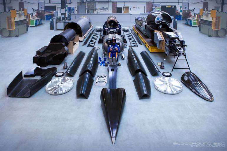 The Bloodhound supersonic car contains over 3,500 components, many custom-made, including: a state-of-the-art Rolls-Royce EJ200 jet engine (normally found in the Eurofighter Typhoon) a cluster of hybrid rockets, developed to power the next generation of space launchers; a 550bhp Supercharged Jaguar V8 – used to pump the oxidiser into the rocket; two unique Rolex instruments specially made for BLOODHOUND SSC; a titanium skinned upper chassis; a carbon fibre monocoque and canopy with 25mm thick windscreen; plus 22,500 aerospace-grade rivets, each hand-fixed.