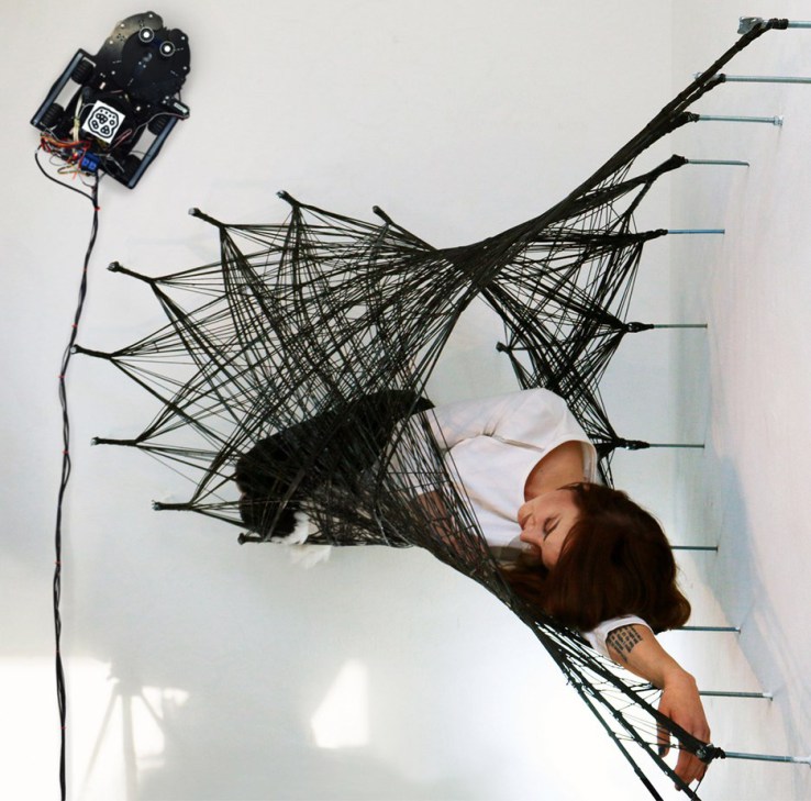 University of Stuttgart graduate Maria Yablonina developed a carbon-fibre fabrication process that uses small robots. These robots climb the walls and ceilings working together to pull carbon fibre filaments across a space, creating a simple structure.
