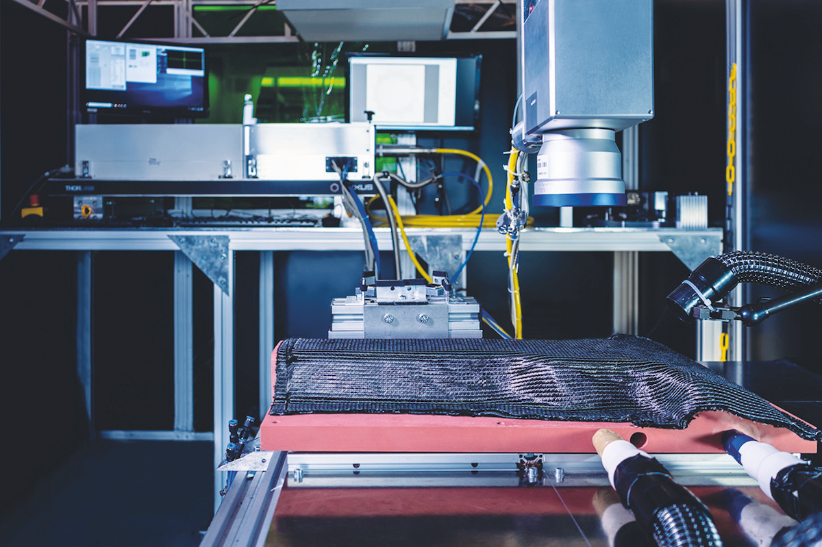 The project team developed a CFRP component manufacturing process that checked all the boxes by opting for a three-pronged approach of CNC cutting, laser processing and automated handling. They combined the technologies for these individual process steps in a single robot cell and automated all the steps in between. First, the preform is created by cutting, stacking and assembling the textiles. Next, an ultrashort pulsed (USP) laser drills high-precision cut-outs in the preforms for the metal fasteners.