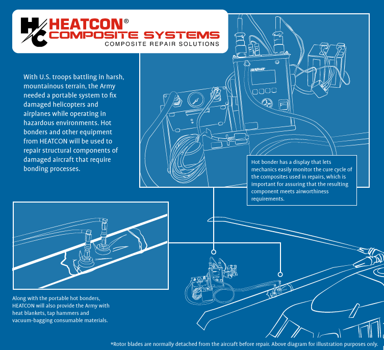 Hot bonders and other equipment from Heatcon will be used to repair structural components of damaged aircraft that require bonding processes. The company is providing the Army with nearly 200 portable hot bonders, which will be used to repair the composite structures on military aircraft.