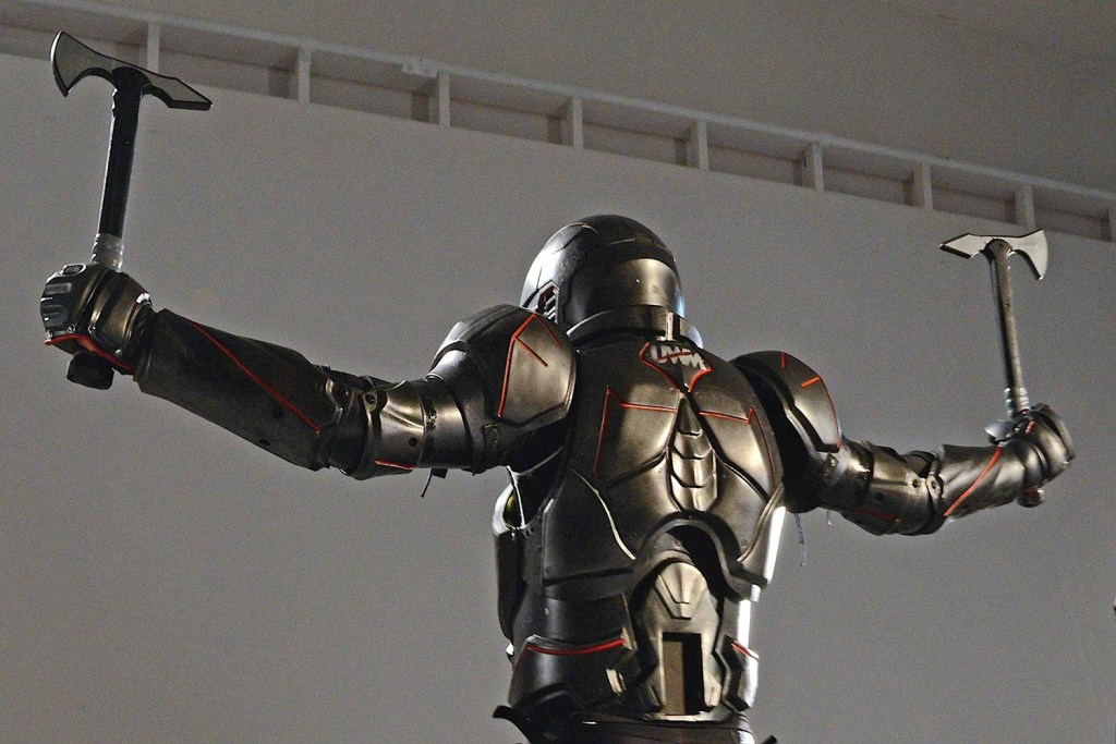 To enable these modern gladiatorial scraps, the company has created the Lorica, a suit of armour made from carbon fibre, polycarbonate materials and elastomeric foam. These materials combine to create a suit that can stand up to a real beating, allowing the wearer to absorb the impact of a weapon and escape unscathed.