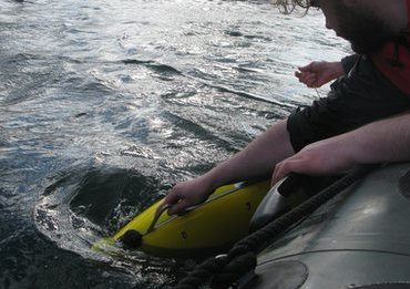 The yellow fish cutting through the waters of Gijon harbour in Northern spain stands out from the normal marine inhabitants....